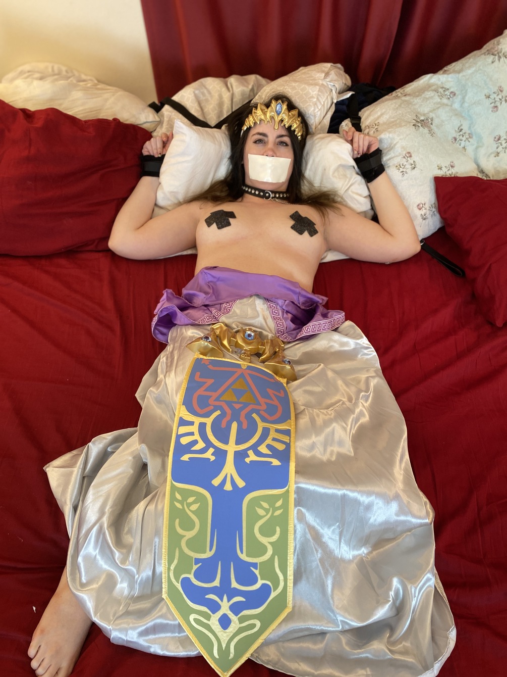 Video/photos feature: Bambi in Zelda (TP) costume. Cleave, OTM, microfoam tape and ball gags, flogging, vibrator action, and pantyshots.